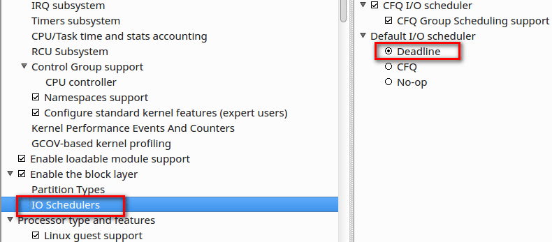 Этот параметр можно найти во вкладке Enable the block layer – IO schedulers.