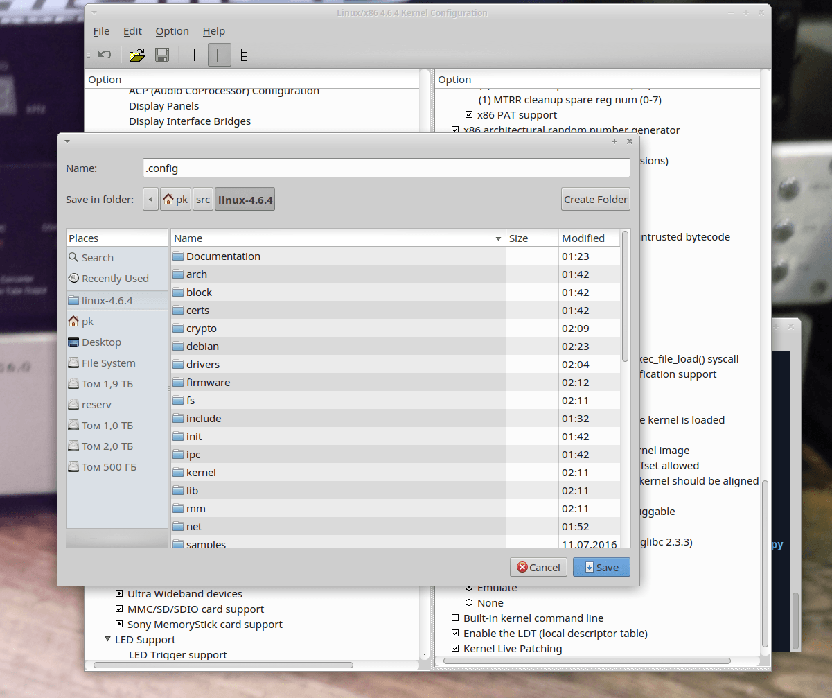 Кроме того, если сейчас дать команду make xconfig, то вам придется настраивать много параметров вручную, логичнее получить их значения из настроек текущего ядра. Для этого скопируем файл конфигурации текущего ядра в папку с исходными кодами нового ядра 4.6.4: