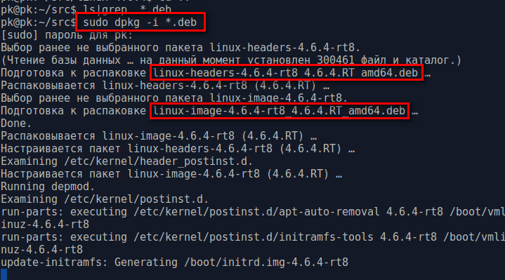 В моем случае сборка велась в пределах 40 минут, после чего в каталоге src появились два пакета с расширением deb, готовых к установке linux-image-4.6.4-rt8_4.6.4.RT_amd64.deb и linux-headers-4.6.4-rt8_4.6.4.RT_amd64.deb.