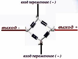С помощью этой схемы, называемой диодным мостом мы получим постоянный ток с конкретным плюсом и минусом на конкретных проводах.