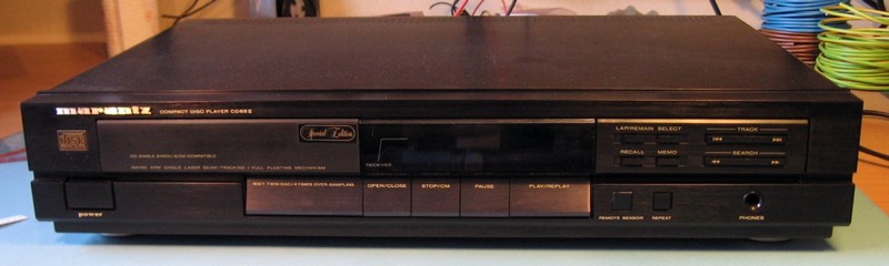 Проигрыватель из верхней линейки аппаратов на 14-битном цап TDA1540 (две штуки в аппарате в силу монофоничности микросхемы). Все железное, включая лоток. Звук по современным меркам начальный, мутный.