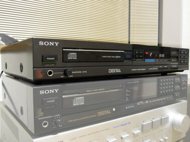 Первый в мире СД-проигрыватель! Стоил очень дорого — 168 000 йен в 1982 году. До сих пор отлично работает и читает диски. Звучание стандартное для того периода, даже более детальное, чем у филипсовского цап TDA1540, благодаря тому вероятно, что натуральные 16 бит у цап CX20017. Очень красивый, блестит. Немножко сибилянты присутствуют — слегка псыкает и тсыкает. Работает без цифрового фильтра с задержкой в 11 мс между каналами, так как по идее нужно было ставить 2 цап, а Сони сэкономила заставив один цап обрабатывать 2 канала!