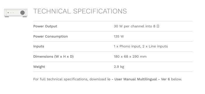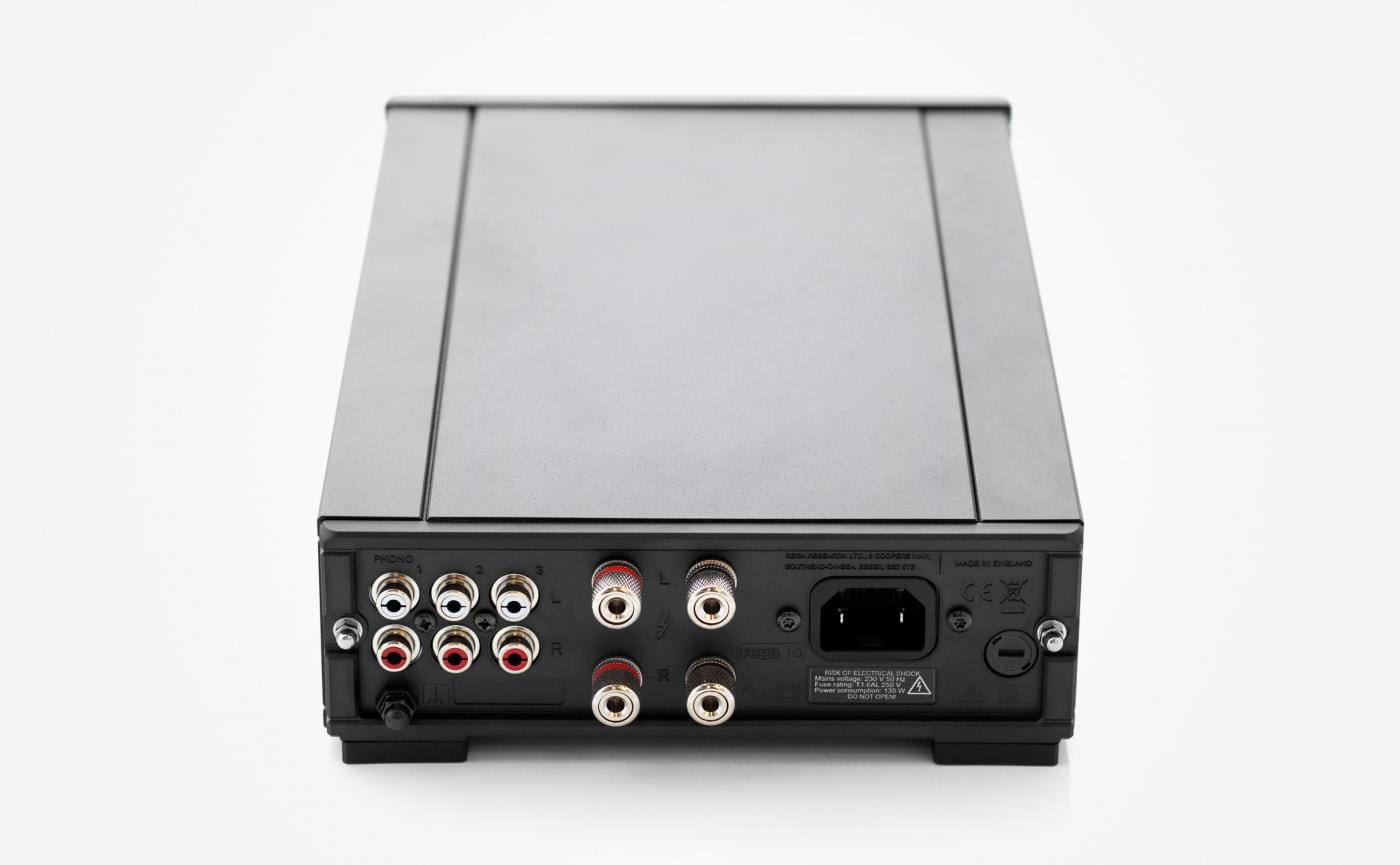 IO стремится обеспечить исключительное качество звука в меньшем и более экономичном корпусе. Схема класса A/B имеет общую ДНК с остальными усилителями Rega, и, как обычно, большое внимание было уделено выбору компонентов. Выходные транзисторы Sanken, потенциометр громкости Alps и линейный источник питания, обеспечивающий выходную мощность 30 Вт на канал при сопротивлении 8 Ом. В качестве источников доступны два входа линейного уровня и высококачественный фонокорректор с подвижным магнитом. На передней панели устройства имеется выход для наушников для питания стандартных наушников Hi-Fi; это управляется от каскада усилителя мощности устройства через реле, чтобы избежать ухудшения сигнала, когда наушники вставлены или продукт отключен. В комплект входит новый переработанный мини-пульт дистанционного управления.