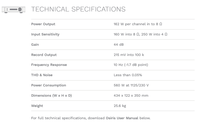 Osiris является кульминацией 32-летнего опыта разработки твердотельных усилителей. Бескомпромиссный, сверхвысокая производительность, 162 Вт на 8 Ом (250 Вт, 4 Ом), двойной моноусилитель в специально изготовленном алюминиевом корпусе Rega с ЧПУ.