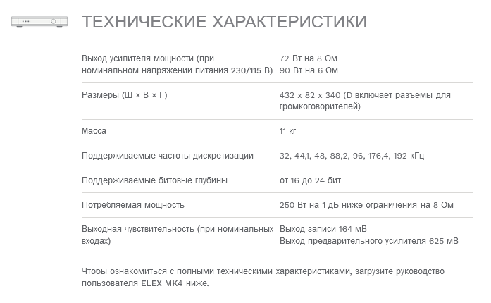 Elex MK4 способен легко управлять сложными громкоговорителями и идеально интегрируется в любую аудиосистему, предлагая более широкий спектр возможностей подключения. В дополнение к линейному уровню, цифровым входам и высококачественному фонокорректору с подвижным магнитом вы также найдете функции Pre-out и Record Out наряду с выходом для наушников. Особое внимание было уделено выбору основных аудиокомпонентов. В конструкции используются дискретная схема, высококачественные реле, полипропиленовые конденсаторы и выходные транзисторы Sanken.