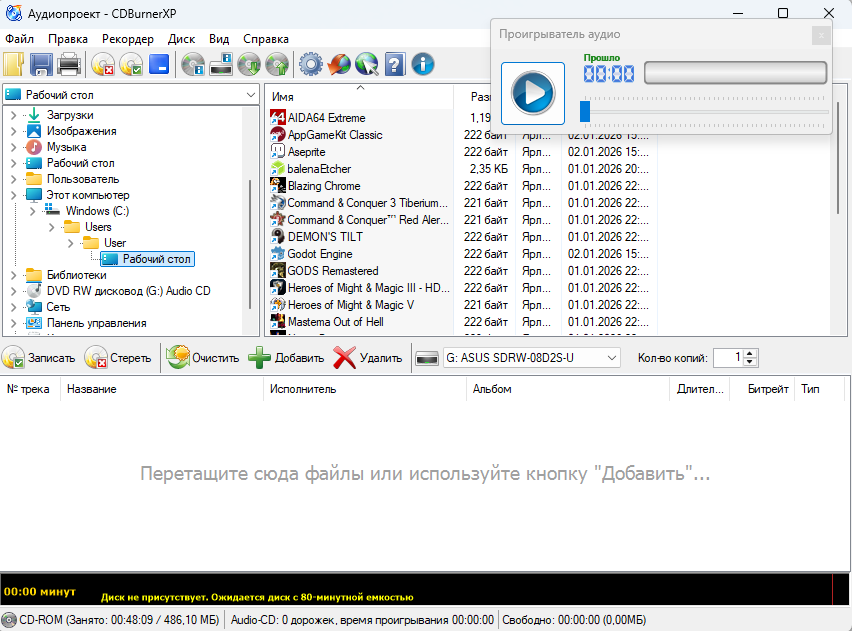 Для записи Audio-CD лучше использовать программы CDBurnerXP или Burrrn.