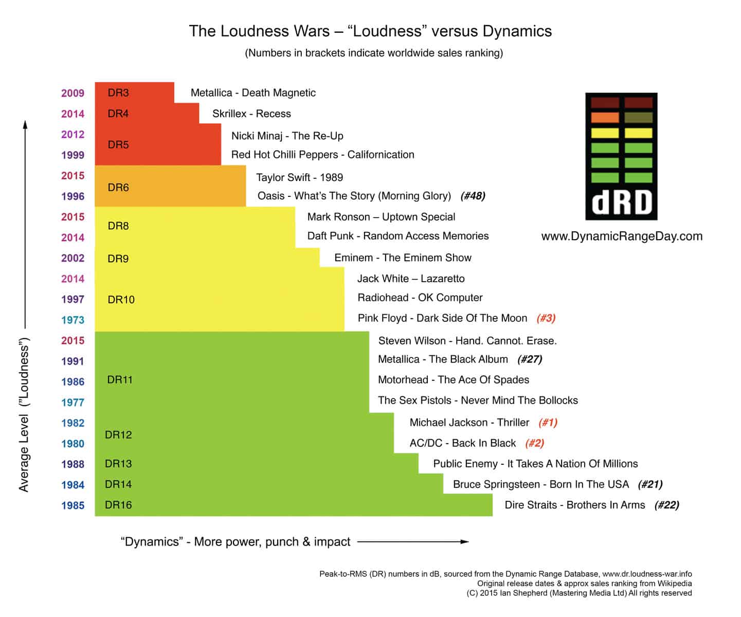 Из этого следует, что объяснять loudness war банальным желанием поднять уровень громкости слишком примитивно.Поднять для чего? Радиостанции все равно выставляют строго свой уровень громкости, и как громко записана запись там не имеет значения, а дома вы громкость регулируете ручкой на усилителе. Т.е. аргумент — не аргумент.
