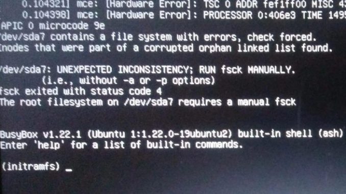 При появлении (initramfs) внимательно изучите текст выше — там может быть конкретная причина (например, unable to find root device или filesystem errors).