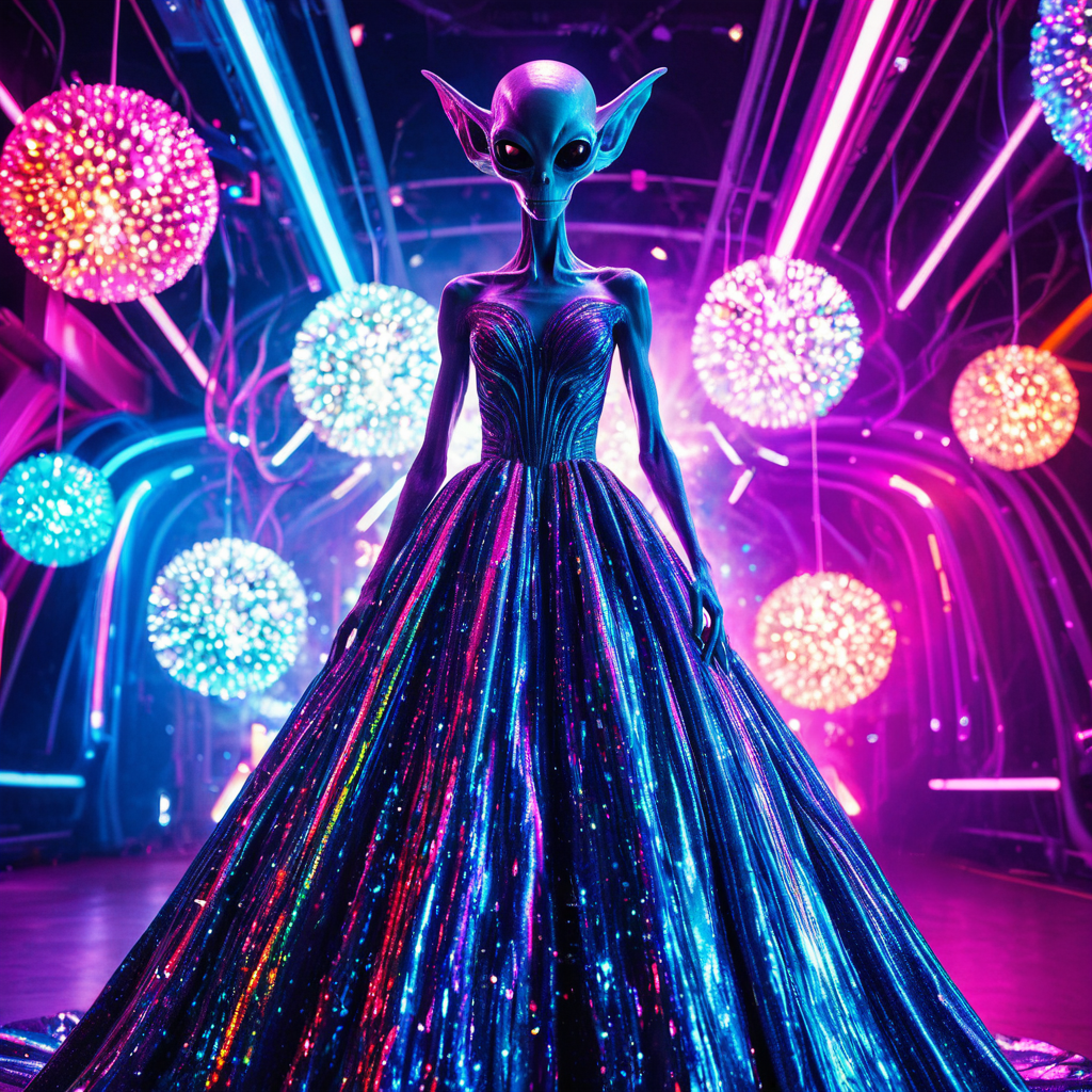 Prompt Example: A tall alien wearing a glittering ball gown covered in iridescent patterns, standing under strange colorful lights