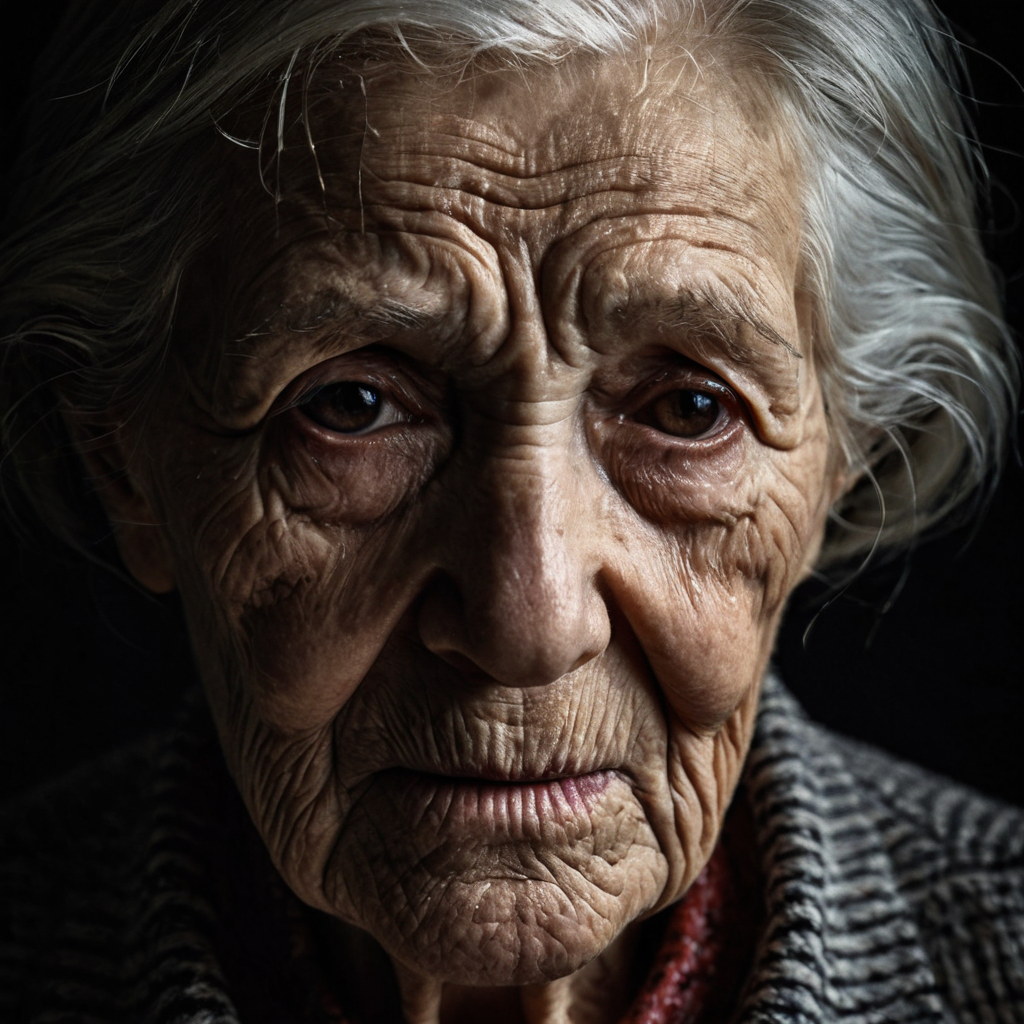 Prompt Example: Close-up of an elderly woman’s face, deep wrinkles highlighted by dramatic lighting, strong shadows across her features, intense and somber mood