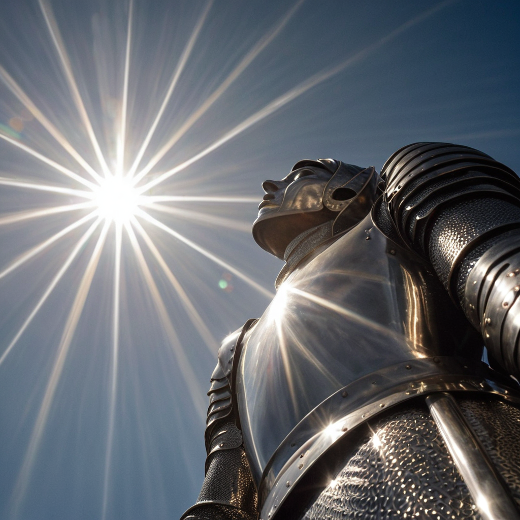 Prompt Example: Looking up at a towering knight in shining armor, dramatic low-angle view, sunlight glinting off polished steel