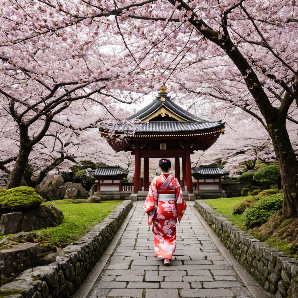 Prompt Example: A traditional Japanese shrine surrounded by cherry blossoms in full bloom, a woman in a flowing kimono walking along a stone path