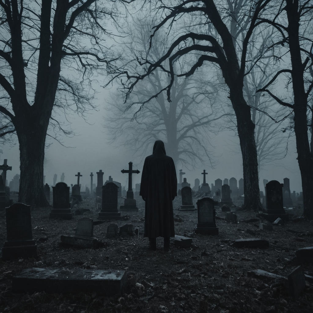 Prompt Example: A lone figure standing in a foggy graveyard at night, surrounded by dead trees and broken tombstones, eerie atmosphere, grim mood, dark cinematic lighting