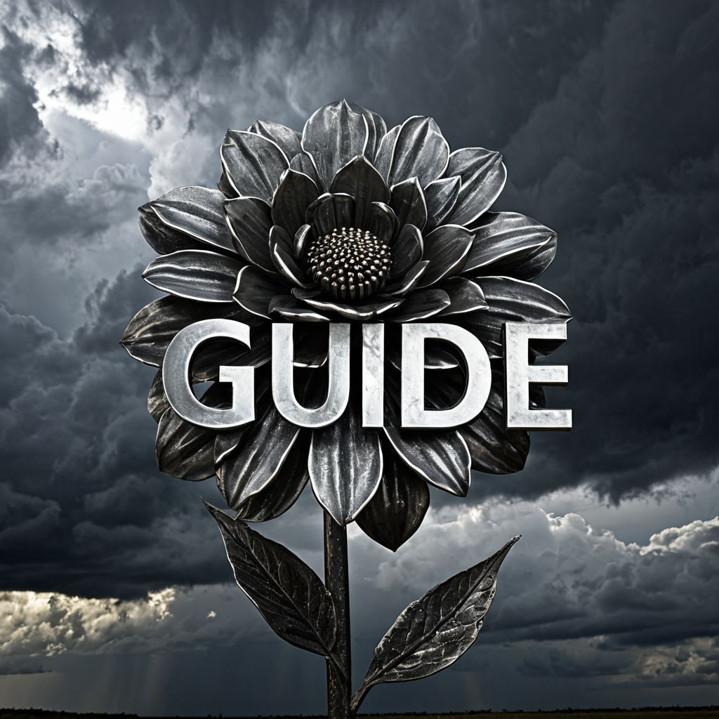 Prompt Example: The word «Guide» in bold metallic letters at the center of the image, A single Metal flower beneath a stormy sky, High resolution