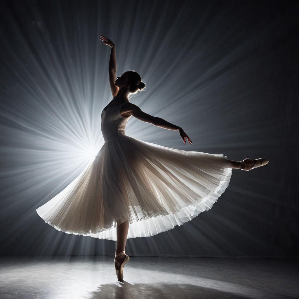 Prompt: An elegant ballerina dancing under a spotlight, graceful posture, flowing white dress, soft expression