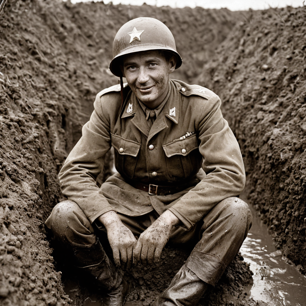 Prompt Example: A WWII soldier sitting in a muddy trench, worn uniform and helmet covered in dirt