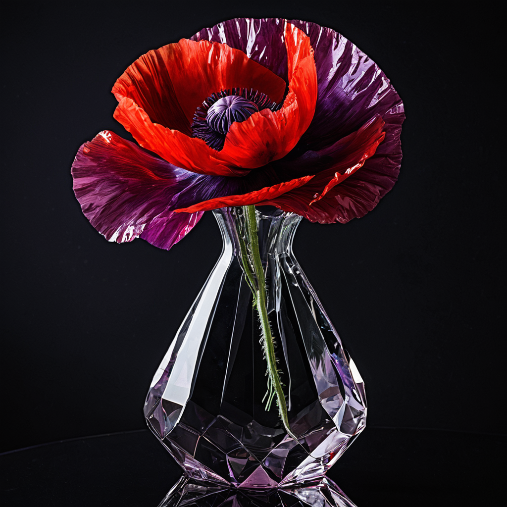 Prompt Example: Close up a large beautiful red and purple poppy blossom in a crystal vase, background black, dramatic lighting