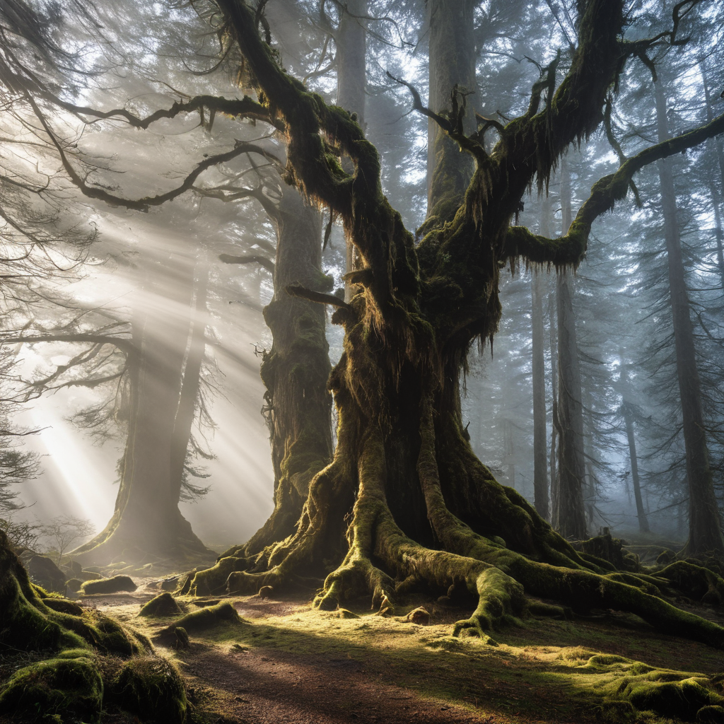 Prompt Example: An ancient forest shrouded in morning mist, sunlight piercing through tall gnarled trees, moss covering the forest floor
