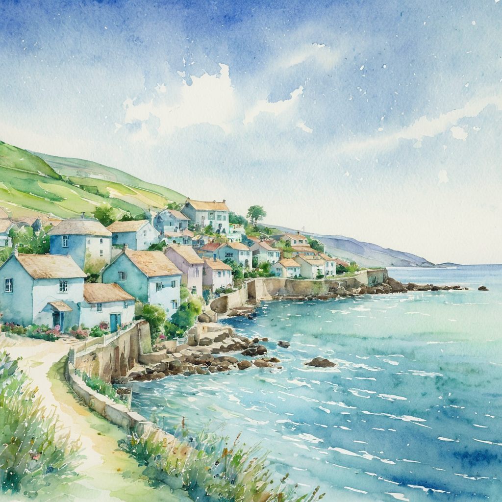 Prompt Example: A watercolor painting of a small village by the sea, blending pastel blues and greens, gentle flowing textures across the sky and water