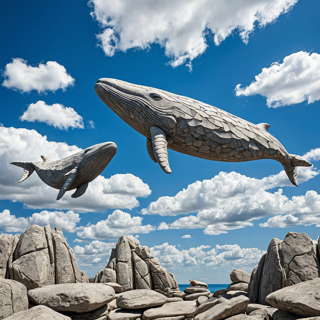 Prompt Example: Surreal photograph of Giant whales made of stone flying through a blue sky with white clouds