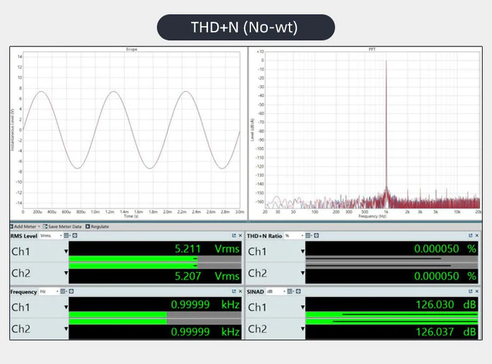 THD + N: 0,00005% (-126 дБ) (БЕЗ WTD)