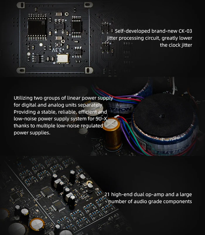 Схема обработки тактовых импульсов CK-03 в SU-X меняет правила игры. Она значительно снижает джиттер тактовых импульсов, обеспечивая чистый, кристально чистый аудиосигнал.