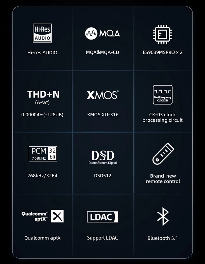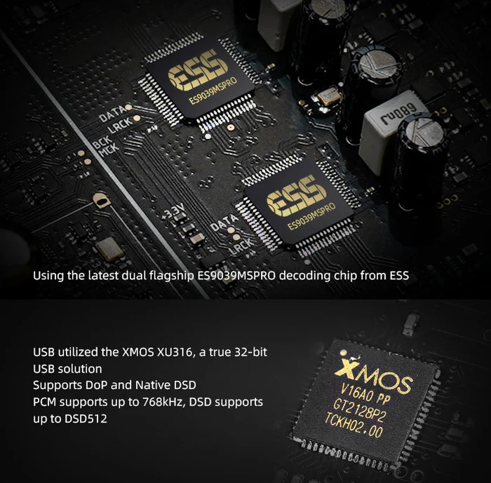 Сердцем SU-X являются два чипа ЦАП ESS ES9039MSPRO. Эти мощные устройства обеспечивают максимально точное воспроизведение аудиодорожек с разрядностью до 32 бит и частотой дискретизации до 768 кГц, позволяя вам услышать все нюансы ваших любимых треков. Кроме того, встроенное декодирование MQA обеспечивает студийное качество звука прямо у вас дома.