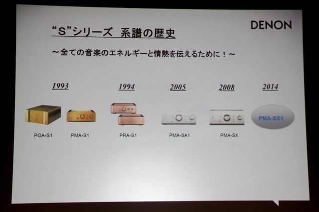Denon PMA-SX1 появится через шесть лет после появления обычного флагманского усилителя Denon PMA-SX . Г-н Йонеда в начале презентации, чтобы поговорить о PMA-SX1, сказал, что необходимо оглянуться назад на историю «серии S», которая является родословной флагманов Denon, и модель S1 1993 года появилась в качестве первой модели серии S. Denon внедрил усилитель S1 как революционный продукт в истории Hi-Fi. Говорят, что технология, которая станет далее основой в серии S, ведущей к PMA-SX1, была применена в интегральном усилителе PMA-S1, а так же в предварительном усилителе серии S1 — PRM-S1 и усилителе мощности POA-S1.