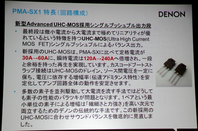 Используемая в SX1 UHC-MOS имеет более высокую емкость, чем UHC-MOS, установленный на PMA-2000RE, выпущенные в прошлом году (2013), но на одно поколение раньше (PMA- 2000 RE UHC-MOS — последнее поколение), и мощность также отличается. Хорошее согласование с PMA-SX1, который поддерживает низкое напряжение за счет использования конфигурации усилителя баланса с полным каскадом, также является причиной выбора этого UHC-MOS.