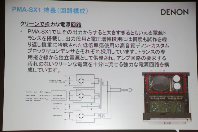Хотя PMA-SX1, использует балансную схему, естественно, он обрабатывает и несимметричный вход фоно. Этот усилитель имеет балансную конструкцию, в которой как балансные, так и небалансные входные сигналы напрямую поступают на каскад усиления сбалансированного напряжения без использования схемы преобразования. Выполняя балансирование с помощью инвертированной схемы баланса, реализуются низкая частота искажений и высокое отношение сигнал/шум, и кратчайший путь прохождения сигнала, хотя это и усилитель баланса. Г-н Йонеда описал эту перевернутую схему баланса, принятую в «POA-3000 RG», как «технологию, которую можно назвать искусством Денона».