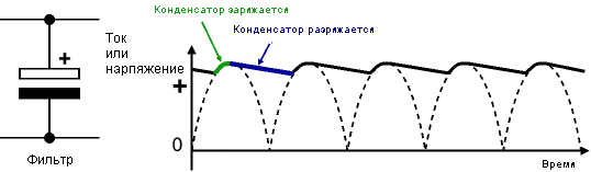 Вот схема диодного моста + электролитический конденсатор для сглаживания при обычном питание.